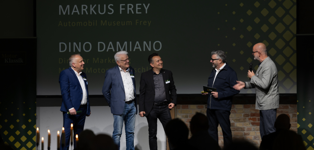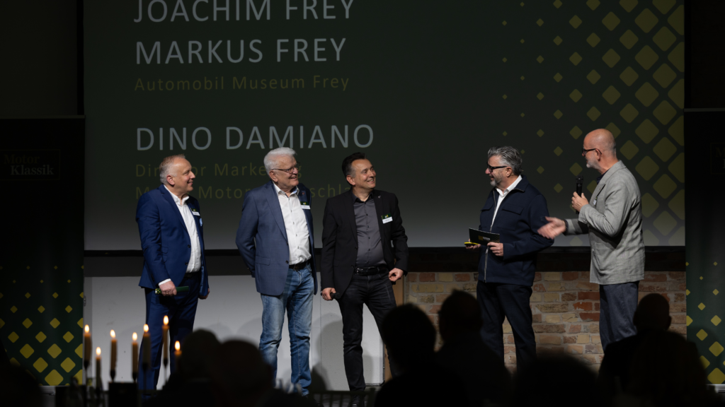 Walter Frey sowie seine Söhne Joachim und Markus Frey standen gemeinsam mit Dino Damiano auf der Bühne. „Den Motor Klassik Award in diesem Jahr bei Mazda Classic in Augsburg ausrichten zu dürfen, erfüllt uns mit großem Stolz“, betonte Dino Damiano. „Seit vielen Jahren arbeiten wir sehr eng mit der Familie Frey zusammen und freuen uns, eine der größten privaten Mazda Sammlungen außerhalb Japans unterstützen zu können.“