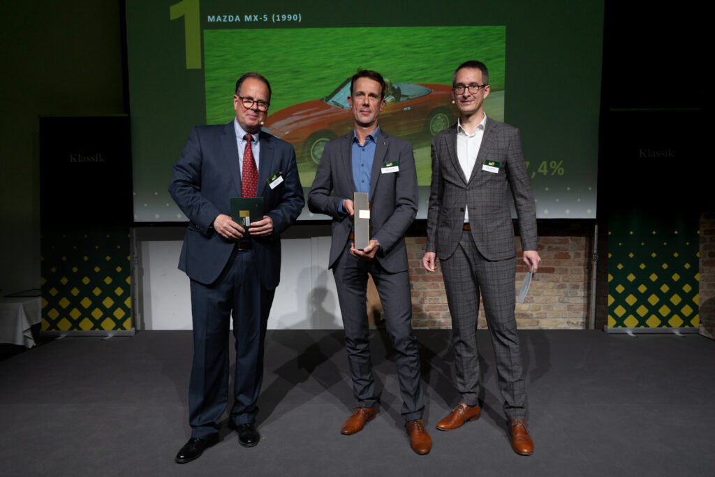 Gleich zwei Auszeichnungen wurden am 16. April 2026 im Mazda Classic – Automobil Museum Frey in Augsburg gefeiert: Der Mazda MX-5 gewann bereits zum vierten Mal in Folge die AUTO BILD-Leserwahl in der Kategorie „Cabrios bis 50.000 Euro – Klassiker der Zukunft“ und wurde zusätzlich in der Kategorie „Japanische Klassiker“ mit dem Motor Klassik Award 2026 ausgezeichnet. Den Award „Japanische Klassiker“ nahm Jochen Münzinger, Direktor Presse- und Öffentlichkeitsarbeit bei Mazda Motors Deutschland entgegen. Den Award “ Klassiker der Zukunft“ durfte Dino Damiano, Direktor Marketing bei Mazda Motors Deutschland entgegennehmen.